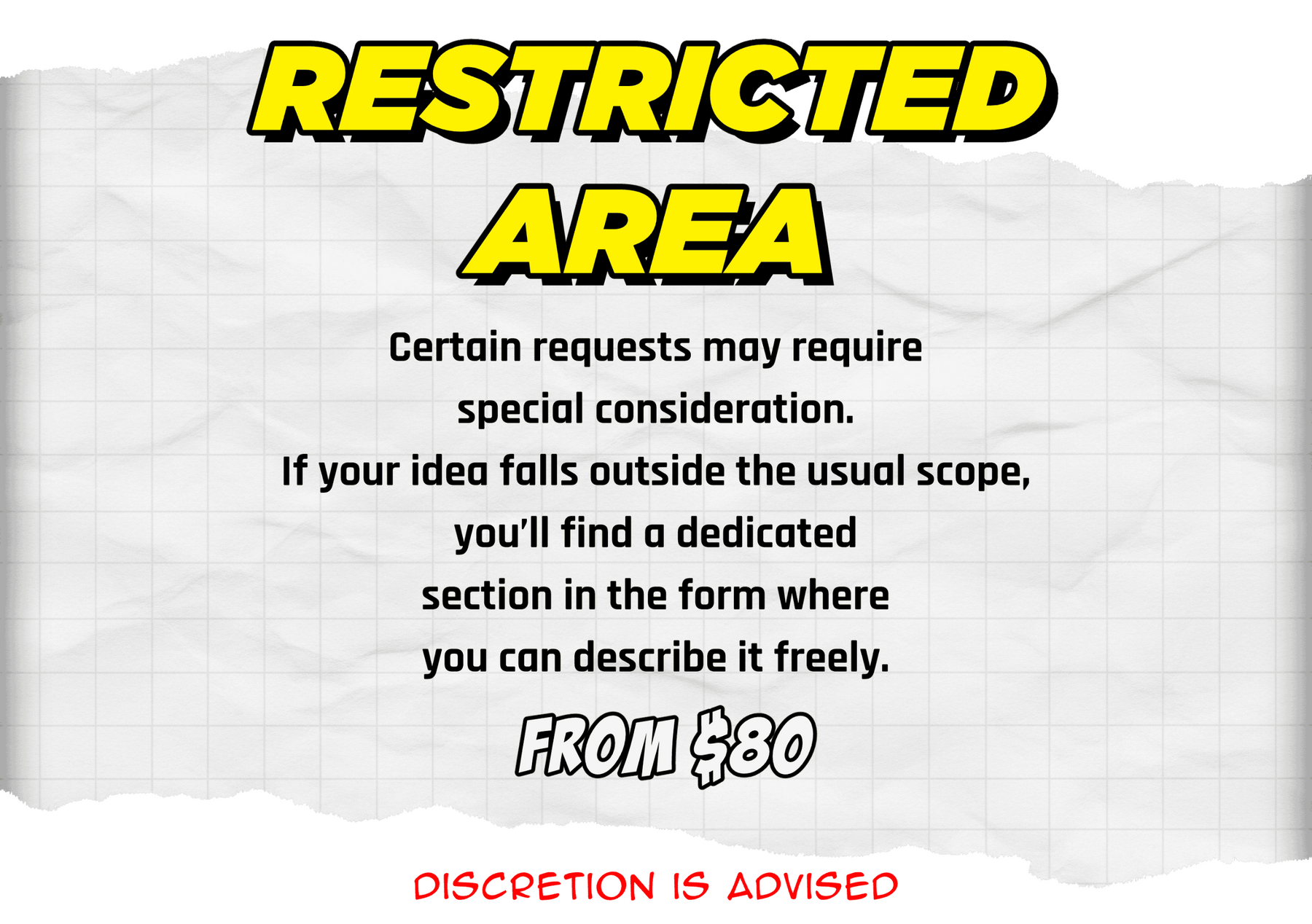 1. Fill out the form with a clear and concise description of everything you would like me to draw. Within 24 to 48 hours, I will review your request and contact you to confirm the details, the total price, the payment method, and any other necessary information. Work will only begin once the payment has been made, never before.2. The commission process may take between 1 and 3 weeks, depending on complexity and workload. During this time, I will send a sketch concept at the pose proposal stage and a color proposal, so the client can request changes. These are the only two stages where modifications are allowed; after this, no further changes will be accepted.3. Once the work is finished, I will send the final files in the requested format. If you wish, you can leave a comment or review as final feedback to be published in the gallery.By submitting a commission request, you confirm that you have read and agreed to the Terms of Service.